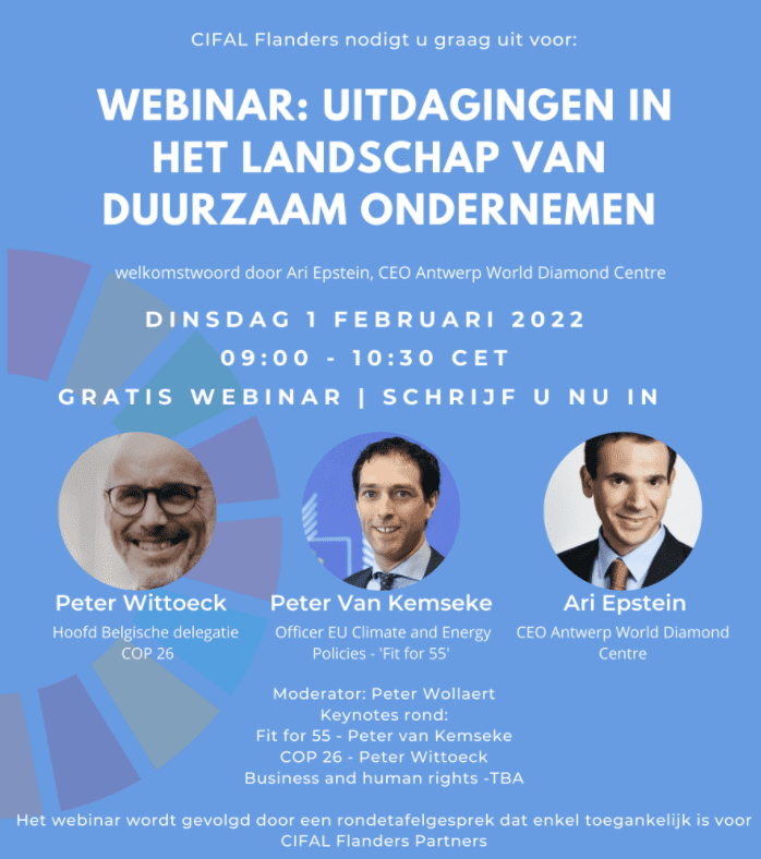 CIFAL Flanders vraagt drie experten om duiding te geven bij drie belangrijke recente ontwikkelingen in het duurzaamheidslandschap, namelijk het EU ‘Fit for 55’ package, de COP 26 en de Belgische Nationale Actieplannen Ondernemingen en Mensenrechten.