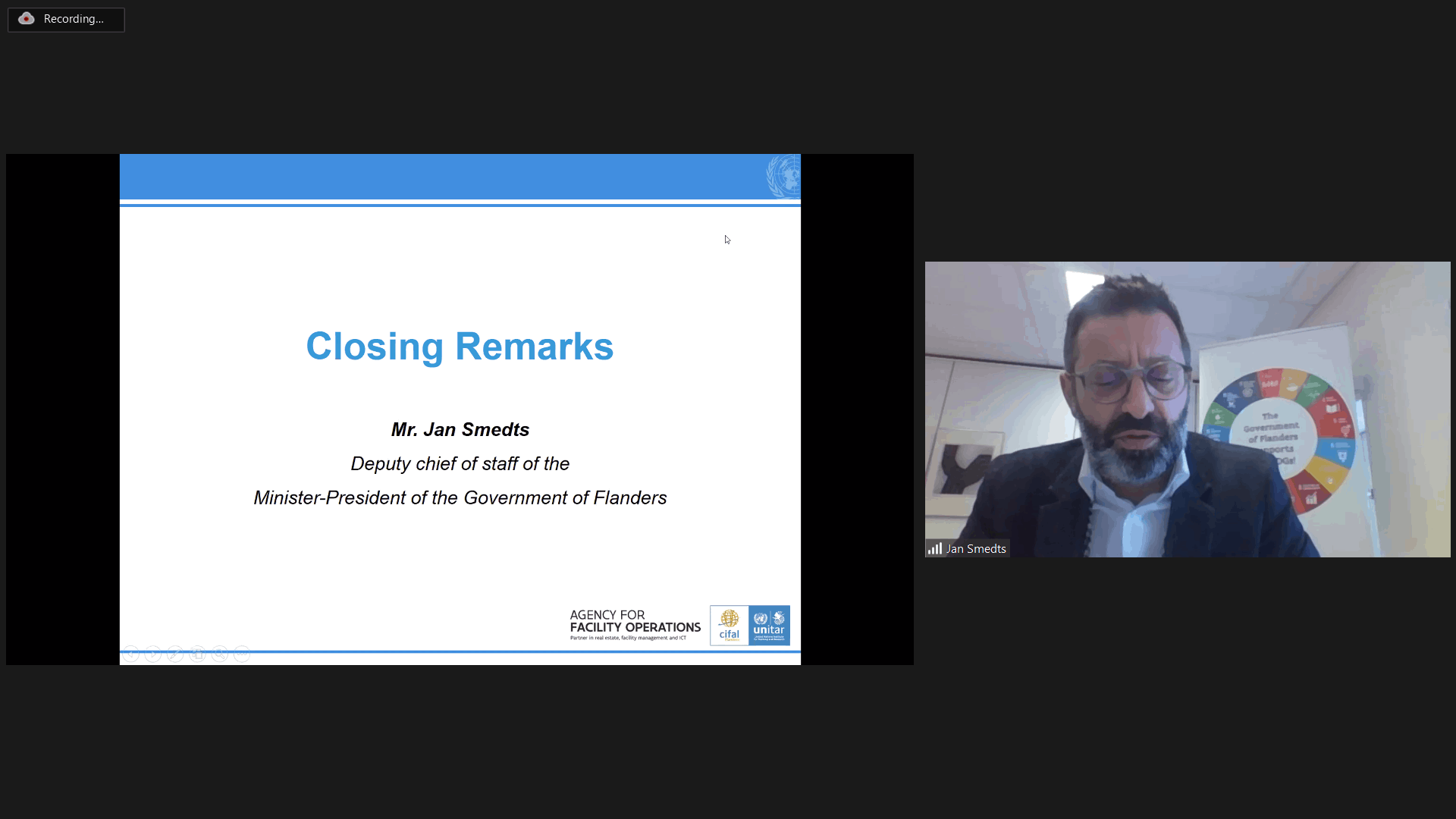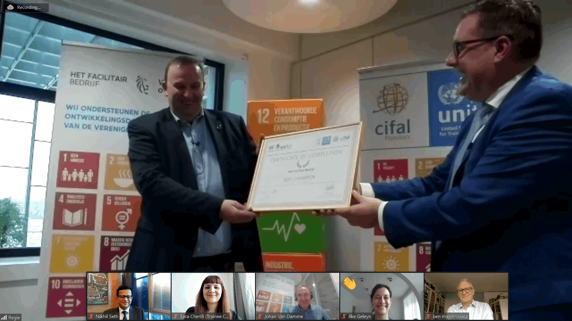 The award ceremony was held on Zoom and included speeches from renowned speakers such as Nikhil Seth, as well as presentations on the SDG Champion trajectory and the efforts of the Agency for Facility Operations of the Flemish Government in becoming an SDG Champion.