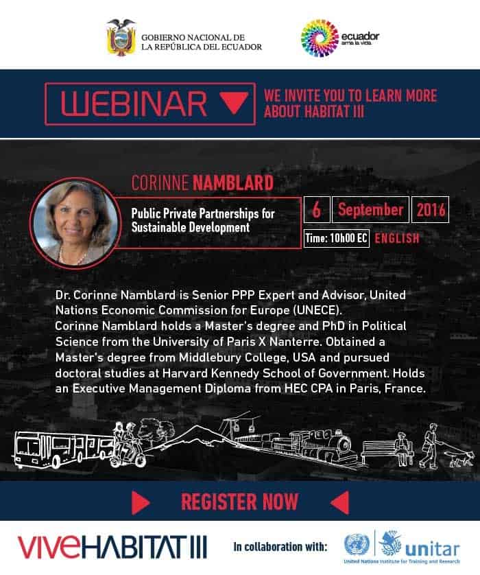 In collaboration with the Government of Ecuador, UNITAR is hosting the Habitat III Webinar titled “Public-Private Partnerships for Sustainable Development” to be delivered 6 September at 10:00 (Ecuador time)/ 17:00 (Geneva time).